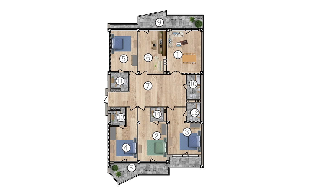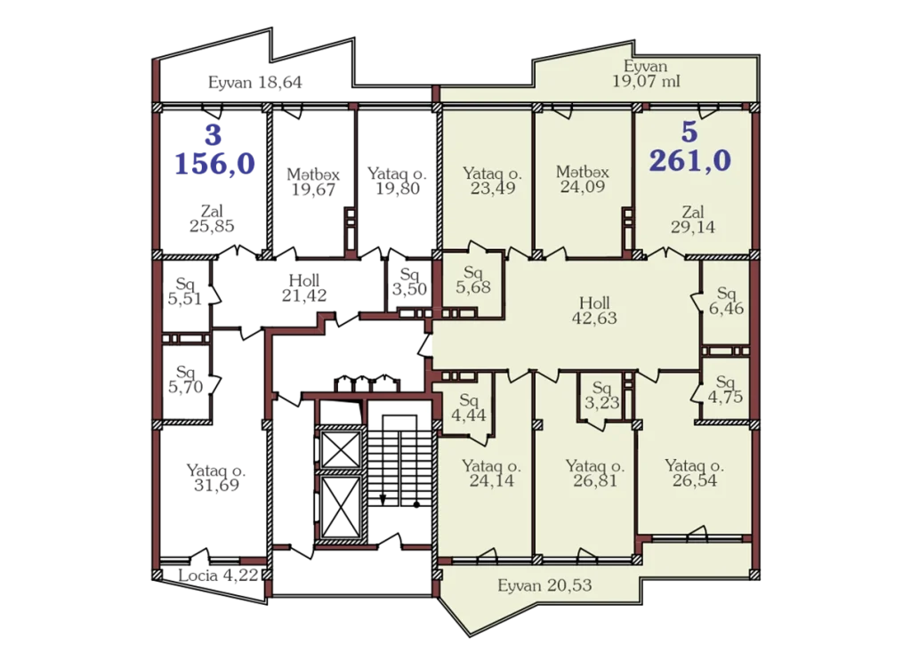 1 - Zal: 29,14 m²2 – Yataq otağı: 26,81 m²3 – Yataq otağı: 26,54 m²4 – Yataq otağı: 24,14 m²5 – Yataq otağı: 23,49 m²6 – Mətbəx: 24,09 m²7 – Holl: 42,63 m²8 – Eyvan: 20,53 m²9 – Eyvan: 19,07 m²10 – S.Q: 6,46 m²11 – S.Q 4,44 m²12 – S.Q: 4,75 m²13 – S.Q 3,23 m²14 – S.Q 5,68 m²